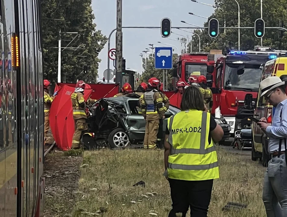 Auta po zderzeniu wylądowały na torowisku tramwajowym, co spowodowało zatrzymanie ruchu pojazdów MPK Łódź w obu kierunkach jazdy.