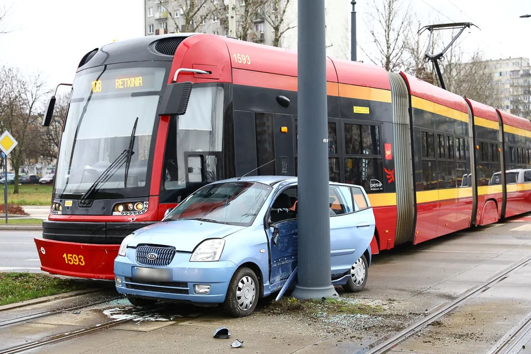 Na łódzkiej Retkini zderzyły się tramwaj i osobowa kia. Tramwaj jechał od strony centrum w kierunku pętli.