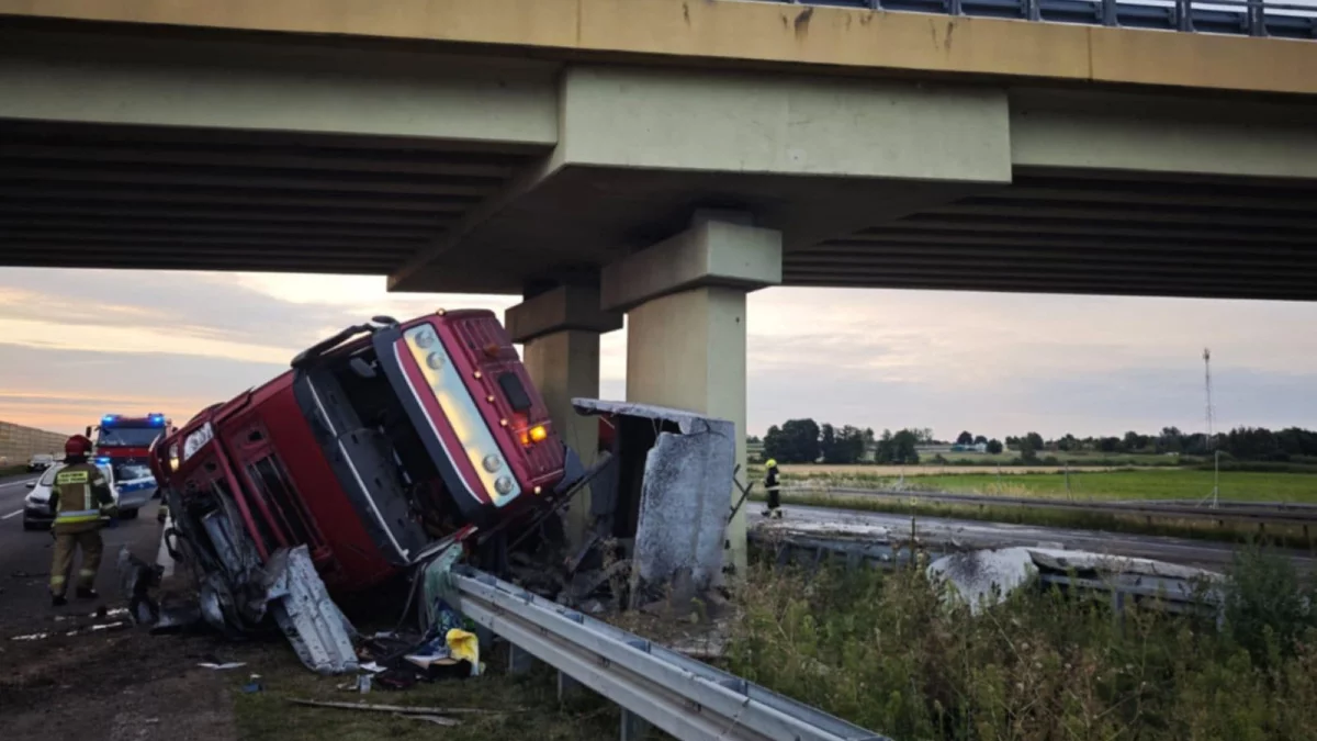 Służby drogowe podały, że samochód ciężarowy najechał na obiekt inżynieryjny.
