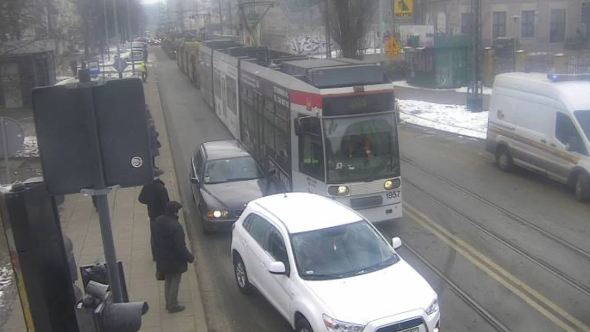 Na wysokości skrzyżowania Pomorska/Sterlinga stanęły tramwaje dwóch linii tramwajowych - 17 i 45.