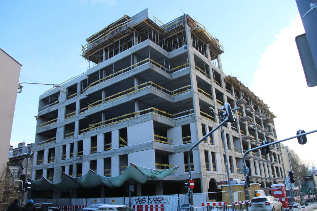 Szczególnie w ostatnich miesiącach budynek bardzo dynamicznie poszybował w górę. Widoczne są piętra, zarysy pomieszczeń oraz miejsca na okna i bramy wjazdowe.