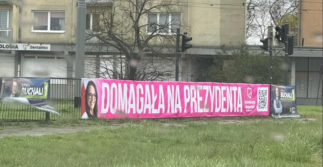 - Pani Klaudii Domagale i Konfederacji polecam w pierwszej kolejności zająć się własną nielegalną kampanią. Poniżej zdjęcie nielegalnie zwieszonej reklamy w pasie drogi - odpowiedział Bartosz Domaszewicz z KO. - Jednocześnie dostrzegam pewien progres. Teraz już konfederaci nie piją, ale za to zajmują się donosami. Pytanie tylko, czy to jest poważny program dla Łodzi.