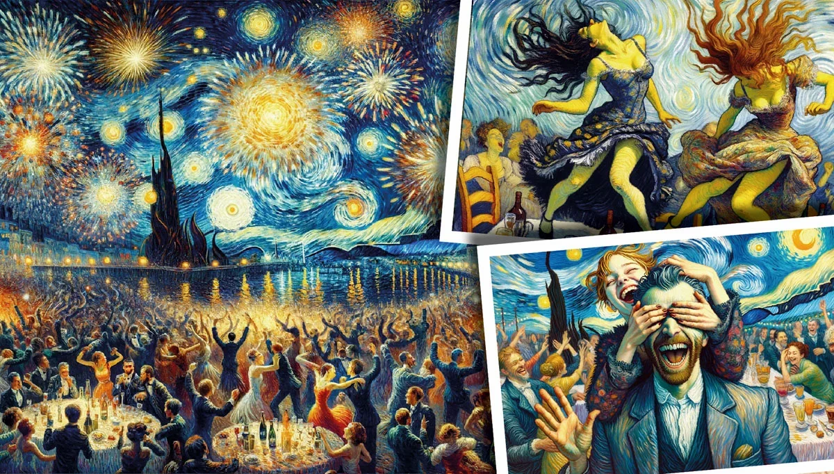 Na nasze życzenie sztuczna inteligencja przyjęła wyzwanie, aby przy użyciu charakterystycznego stylu van Gogha przedstawić różnorodne sceny związane z zabawą sylwestrową. Wśród namalowanych obrazów znalazły się takie z tanecznym rozmachem, toasty szampanem, a nawet spektakularne pokazy fajerwerków. Zadanie zostało zlecone pod hasłem przygotowania scen z "sylwestra marzeń". AI w oparciu o wstępne, ogólne sugestie wykreowała serię malowideł opartych a stylu van Gogha. Efekt finalny możecie podziwiać w galerii pod artykułem.