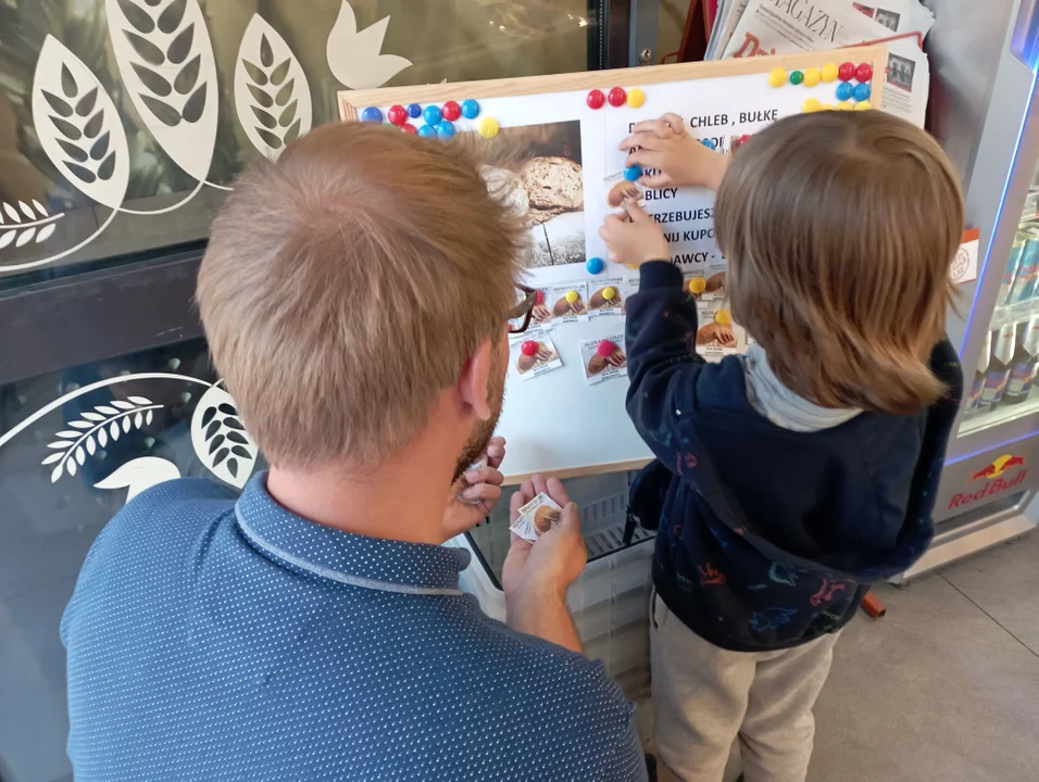 Wśród klientów była rodzina z trójką dzieci. Poza pieczywem dla siebie kupili 9 kuponów na tablicę.
