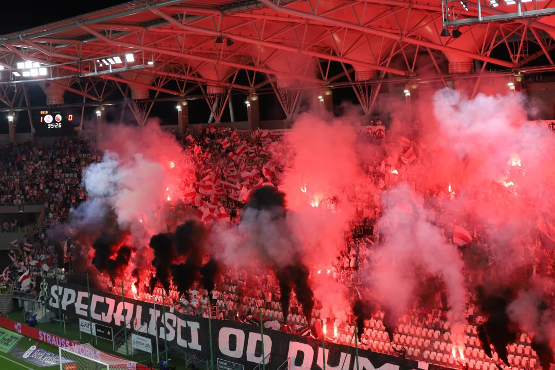 W pierwszej połowie emocji nie brakowało. Najpierw sędzia zarządził kilkuminutową przerwę ze względu na zadymienie boiska po odpaleniu rac przez kibiców ŁKS-u. Następnie w polu karnym gospodarzy Nacho Monsalve trafił głową w biodro Engjella Hotiego. Na boisku musieli zostać wezwani ratownicy. Hiszpian opuścił je na noszach.