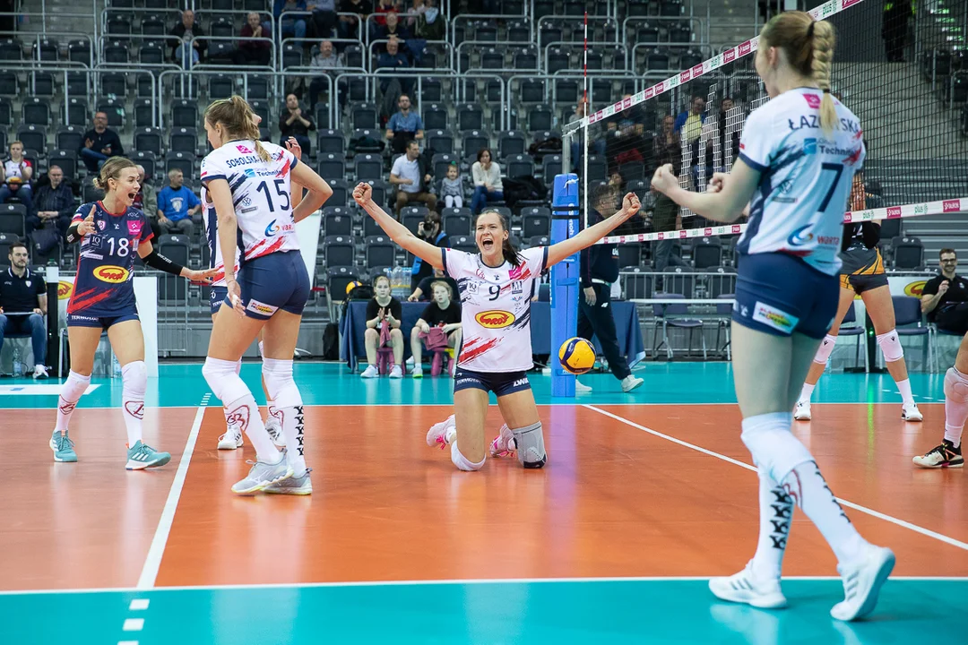 Grot Budowlani słabiej weszli w to spotkanie. Po bloku Orzyłowskiej na Julii Kąkol goście prowadzili w Sport Arenie 7:4. Łodzianki jednak zanotowały serię sześciu kolejnych wygranych piłek z rzędu i nagle z trzypunktowego debetu, na jakim się znalazły, wyszły na prowadzenie 10:7. Niebiesko-biało-czerwone umiejętnie trzymały przeciwniczki na dystans i ostatecznie wygrały 25:20.