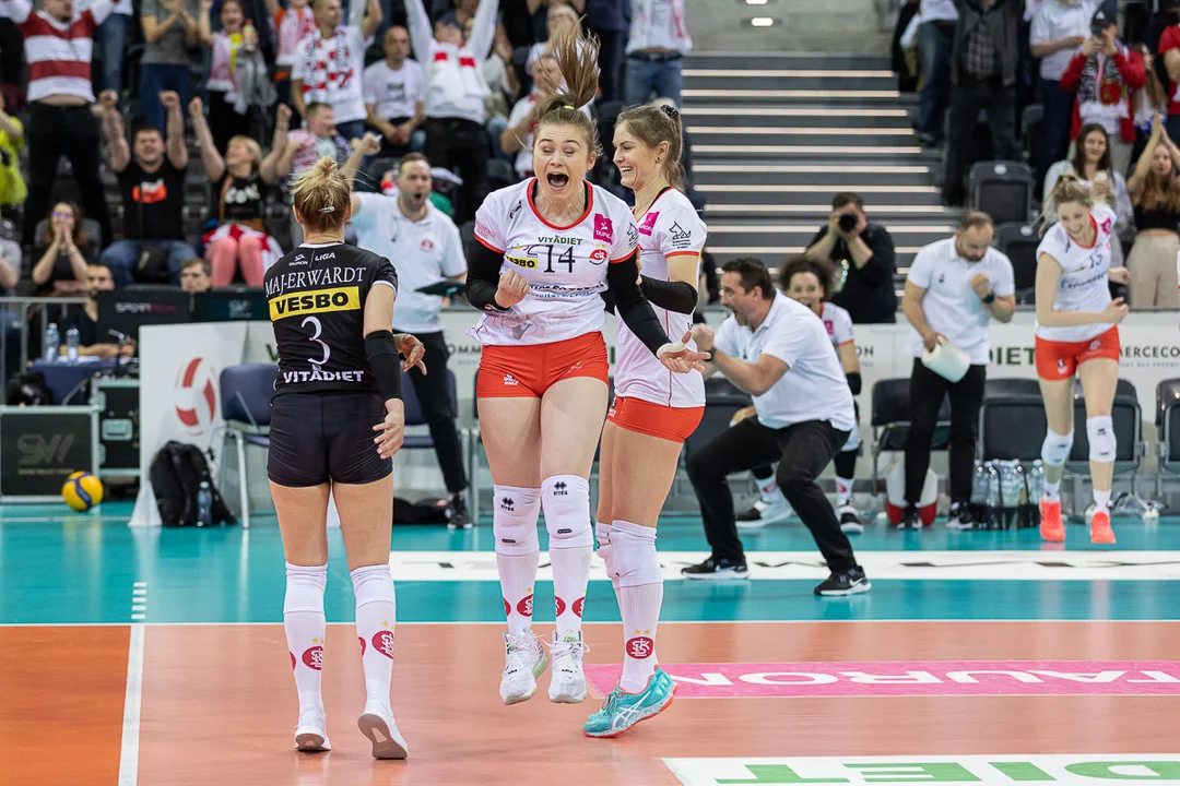 Pierwszą większą przewagę zbudowały sobie Ełkaesianki, gdy inteligentnie ręce Martyny Łazowskiej obiła Veronica Jones-Perry. ŁKS Commercecon prowadził wtedy 8:5. Budowlane zdołały doprowadzić do remisu, kiedy swój drugi punkt w tym spotkaniu zdobyła Paulina Damaske. Młodą przyjmującą Grot Budowlanych starała się zatrzymać Roberta Ratzke, ale Brazylijka nie dała rady i mieliśmy remis 13:13. Emocji nie brakowało. Wiewióry bardzo szybko odbudowały przewagę 16:13, ale momentalnie straty z nawiązką odrobiły niebiesko-biało-czerwone. Znów pokazała się Paulina Damaske, a jej klub prowadził 17:16. W końcówce górą jednak był ŁKS. Roberta Ratzke posłała zagrywkę, z którą sporo problemów miała Zuzanna Górecka, czego konsekwencją był błąd przy próbie wystawy Moniki Fedusio. Ełkaesianki wygrały 25:21 i to one rozpoczęły od prowadzenia walkę o brązowy medal.