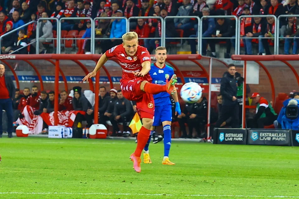 43’ - Kapitalnie piłkę opanował i podciągnął całą akcję przez kilkadziesiąt metrów Dominik Kun. Na końcu pomocnik odegrał do będącego na czystej pozycji Ernesta Terpiłowskiego, ale ten zmarnował kolejną okazję.