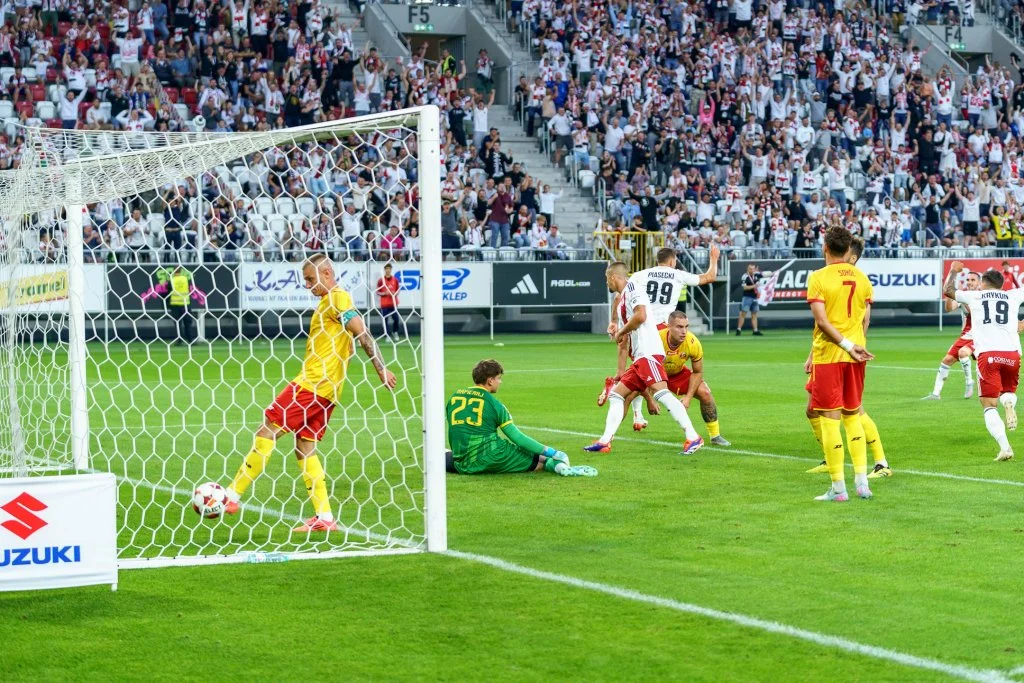 ŁKS potrzebował kilku minut, żeby wejść na właściwe obroty, ale jak już to zrobili, to zdominowali przeciwnika na długie minuty pierwszej połowy. W poprzednim sezonie łodzianie też potrafili prowadzić grę, ale mieli ogromny problem ze znajdowaniem drogi do siatki. Tym razem zrobili to już w 11. minucie. Zamieszanie w polu karnym wykorzystał Filip Piasecki i z bliska otworzył wynik tego meczu.