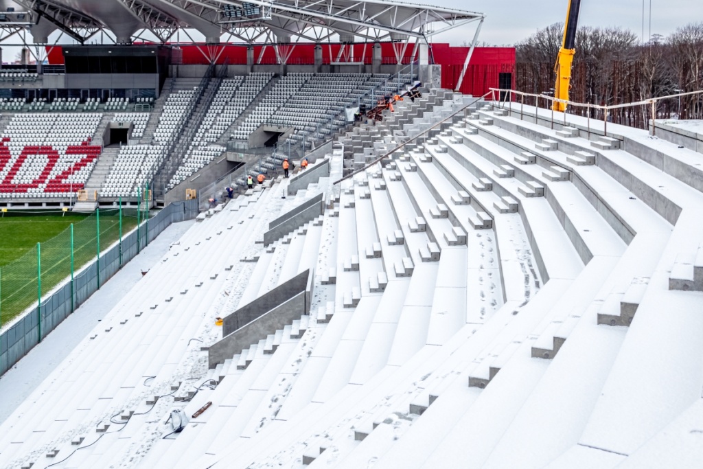 W minionych tygodniach, mimo intensywnych opadów śniegu i mroźnej temperatury, udało się wykonać część prac żelbetowych oraz zamontować elementy prefabrykowane na trybunie północnej.