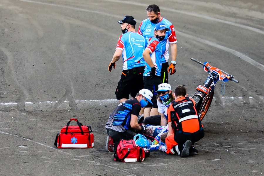 Orzeł Łódź. Groźnie wyglądający wypadek z udziałem Aleksandra Łoktajewa. Łódzki żużlowiec zabrany przez karetkę (Fot. Michał Pietrzak/TuŁódź.pl) |