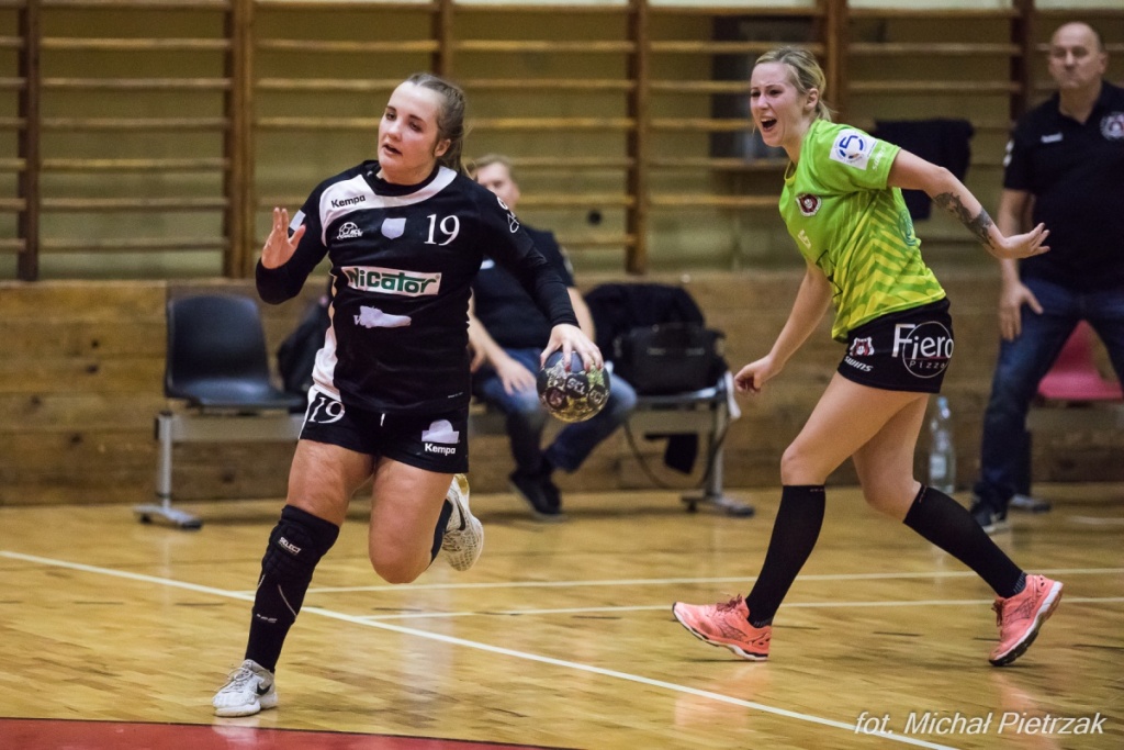 Początek sobotniej rywalizacji był bardzo wyrównany. Obie ekipy zdobywały bramki praktycznie na zmianę, po dziesięciu minutach gry na tablicy wyników widniał rezultat 4:4, a po dwa trafienia zaliczyły Zuzanna Pesel i Milena Walicka. Przez kolejne kilka minut, lekką przewagę osiągnęły szczypiornistki MKS-u, które dzięki dobrej grze w ataku zdołały nieco odskoczyć łodziankom, jednak ani razu nie więcej niż na dwa punkty. Dzięki temu, ChKS PŁ cały czas pozostawał w grze i czyhał na błędy rywalek. W 23. minucie Marlena Gitzel za sprawą wykorzystanego rzutu karnego doprowadziła do remisu, a chwilę później dzięki kolejnej bramce tej zawodniczki, łodzianki wyszły na prowadzenie. Ostatnie pięć minut zdecydowanie należały do przyjezdnych, które rzuciły gospodynią pięć bramek, a te było stać tylko na jedno trafienie. Na przerwę w lepszych nastrojach schodziły więc Czerwono-Czarne, który prowadziły 14:11.