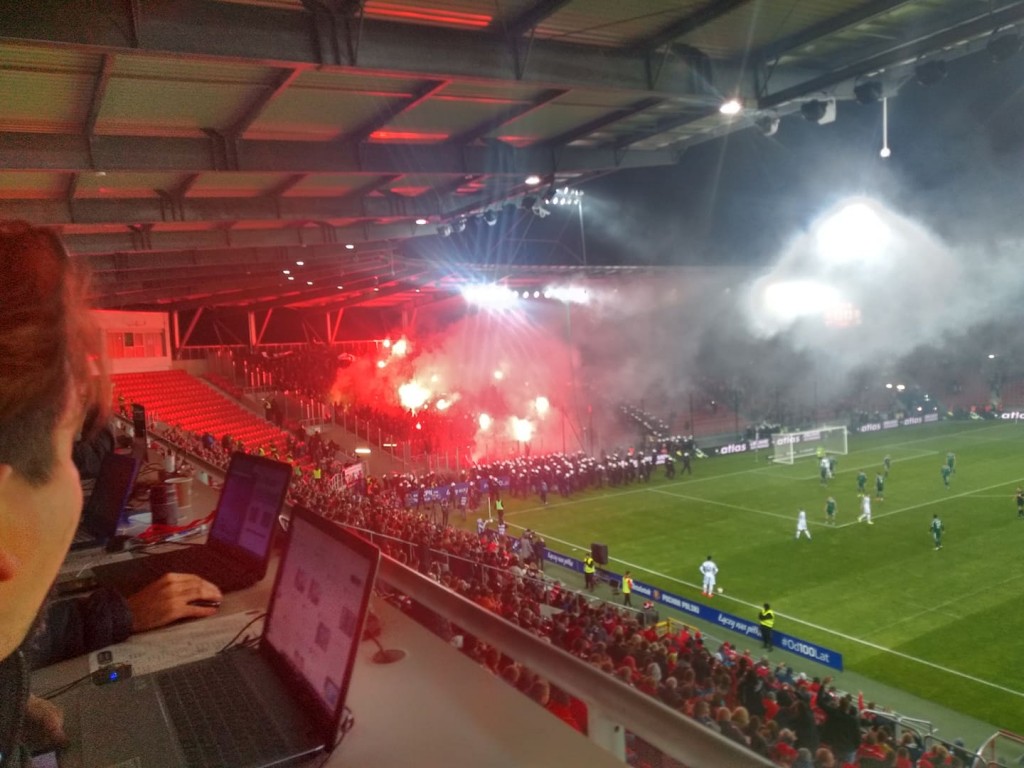 Jak się okazało, informacje dziennikarza się sprawdziły. W 4. minucie mecz musiał zostać przerwany na blisko 10 minut, bo w sektorze gości zostały odpalone race, a kibole z Wrocławia byli agresywni wobec fanów Widzewa.