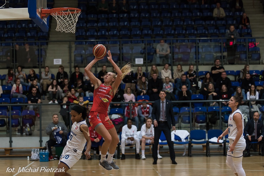 Bardzo aktywna od pierwszych minut była natomiast druga z Amerykanek - Taylor Emery, która wraz ze swoimi koleżankami wypracowała pięciopunktową przewagę (11:6). Łodzianki dość szybko mogły ją roztrwonić, ale przyjezdne nie trafiły kilku rzutów i po celnych trafieniach Drop i Davis było 15:8. Ostatecznie niesione głośnym dopingiem koszykarki Widzewa udanie weszły w mecz, bo po pierwszej kwarcie prowadziły 18:8 i to mimo że w ostatnich dwóch minutach tej części meczu trener pozwolił odpocząć pierwszej rozgrywającej - Julii Drop.