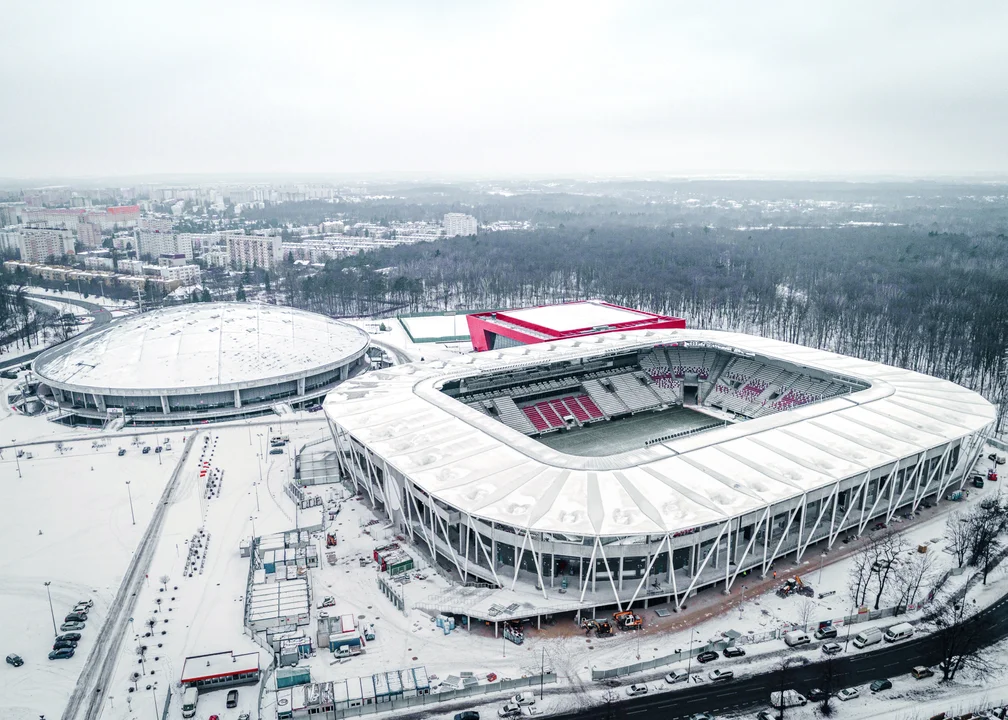 Stadion ŁKS-u Łódź z lotu ptaka. Piękny widok w zimowej aurze