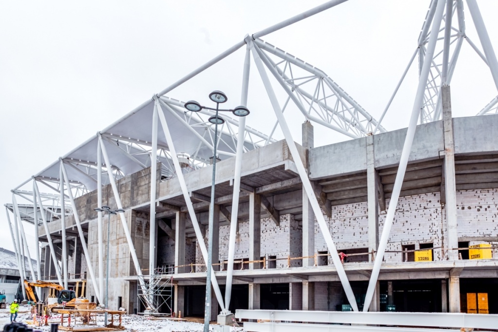 W minionych tygodniach, mimo intensywnych opadów śniegu i niskiej temperatury, udało się wykonać część prac żelbetowych oraz zamontować elementy prefabrykowane na trybunie północnej.