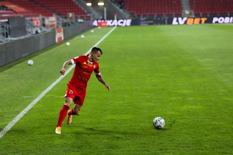 65’ - Stępiński dośrodkował z prawej strony, zagranie przedłużył Marcin Robak, a Dominik Kun nie zdołał celnie zamknąć całej akcji. Piłka wyszła na aut bramkowy.