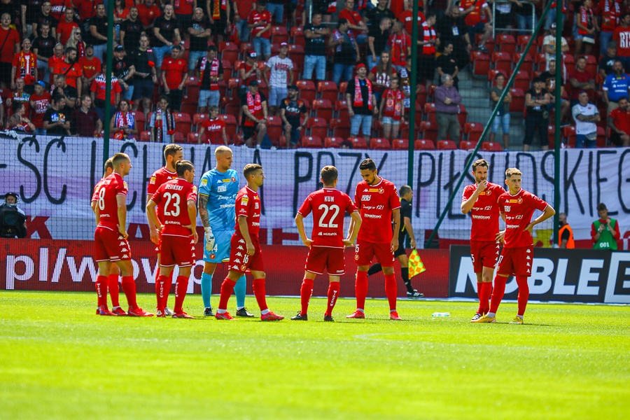 74’ - Znów groźnie było pod bramką Widzewa. Po stałym fragmencie gry jeden z piłkarzy gości zgrał piłkę głową wzdłuż lini bramkowej, a tam źle w piłkę z bardzo bliskiej odległości tracił kolejny z piłkarzy Chrobrego. Powtórki pokazały, że był jednak szarpany za koszulkę przez Bartosza Guzdka. Rezerwowy napastnik łodzian miał mnóstwo szczęścia, bo wydawało się, że to powinien być rzut karny dla gości. Sędzia Paweł Raczkowski na VARze zdecydował jednak inaczej.