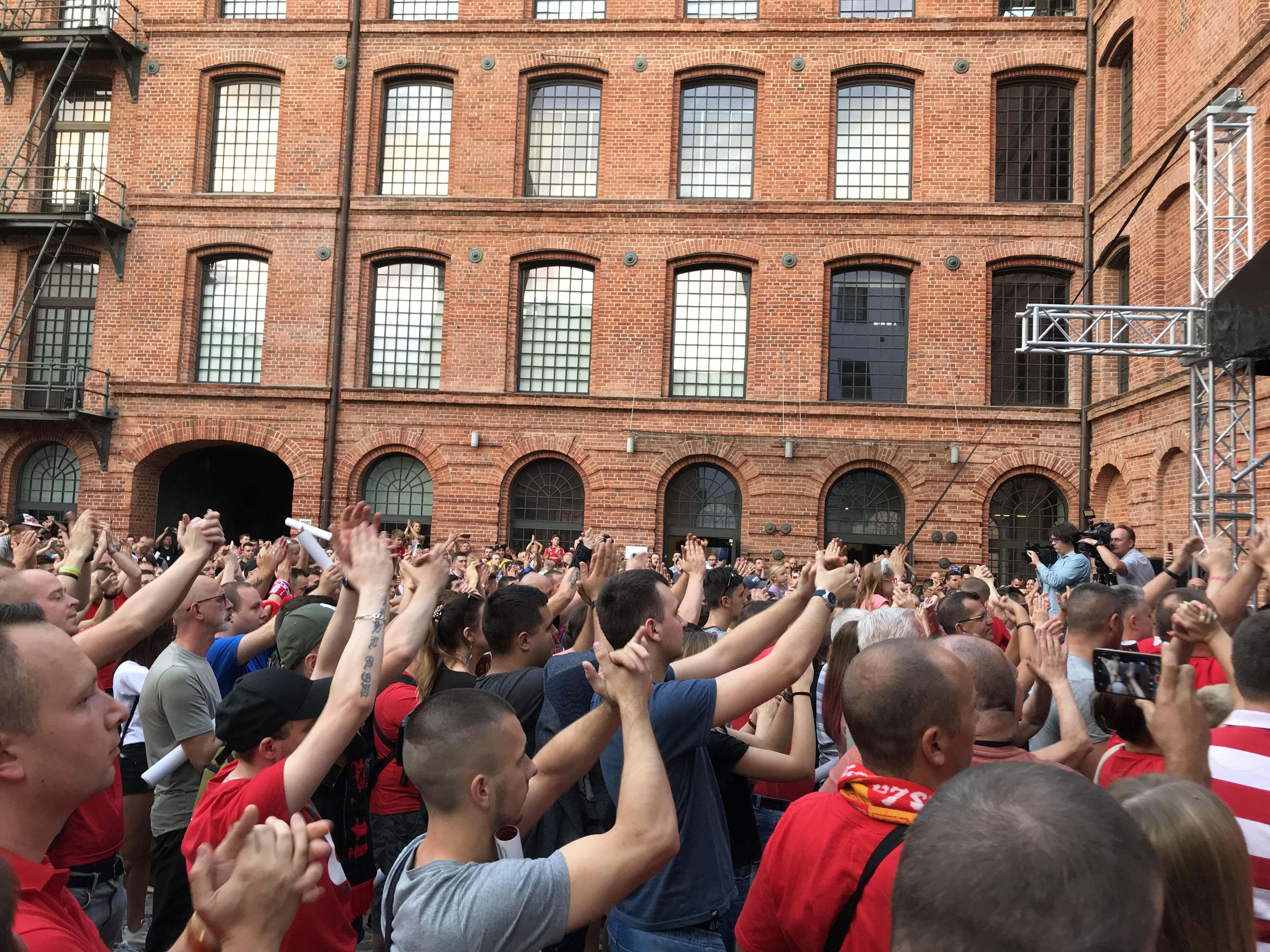 Fani zebrani na placu zostali przywitani muzyką, a dokładniej „Tańcem Eleny”, który towarzyszy im także przed każdym meczem domowym Widzewa. Później odegrano „Prząśniczkę”, która ma zostać włączona do przedmeczowej oprawy na stadionie przy Piłsudskiego 138.