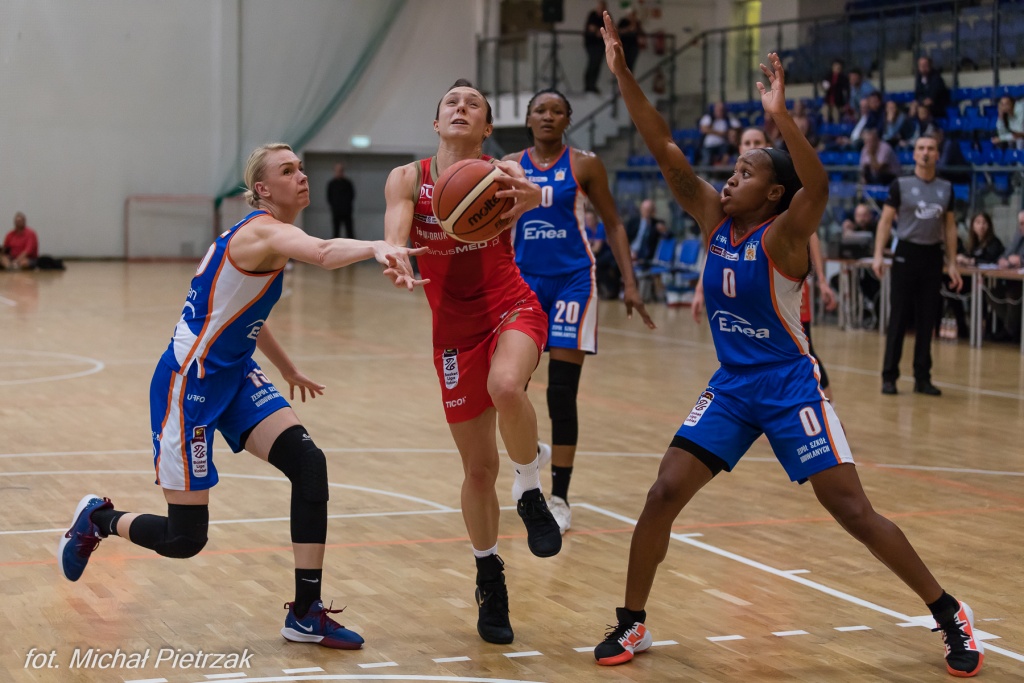 Zawodniczki Widzewa, głównie dzięki wspomnianej Vucković zaczęły budować przewagę, która w pewnym momencie wynosiła już nawet 13 punktów. Do końca pierwszej połowy celne rzuty Smith oraz Martyny Koc pozwoliły na zniwelowanie straty do 8 punktów i po 20 minutach na tablicy wyników było 31:39.