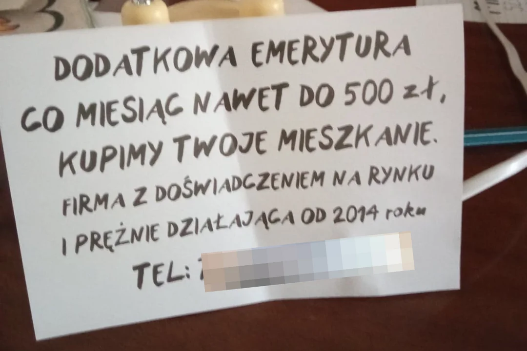 Jeśli mieszkasz w bloku, to z pewnością przynajmniej raz do Twojej skrzynki trafiło tajemnicze ogłoszenie, które napisano niby odręcznie na kartce papieru. Osoba pozostawiająca je w skrzynkach na listy informuje, że jest zainteresowana zakupem mieszkania w naszym budynku. Co więcej, płatność ma zostać dokonana w gotówce, a stan techniczny i prawny naszego lokalu nie ma dla nabywcy żadnego znaczenia. Od pewnego czasu m.in. na Zarzewie, mieszkańcy znaleźli w swoich skrzynkach karteczki z ofertą dodatkowych emerytur. O co z tym wszystkim chodzi?