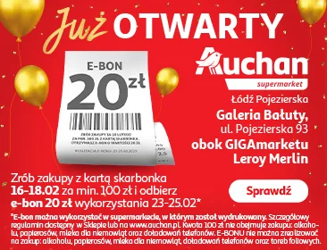 *Aby otrzymać e-bon należy zrobić zakupy z kartą skarbonka 16-18.02 za min.100 zł. Kwota 100 zł nie obejmuje zakupu: alkoholu, papierosów, mleka dla niemowląt, doładowań telefonów. E-bon można wykorzystać w supermarkecie, w którym został wydrukowany w terminie 23-25.02.2023 r. E-BONU nie można zrealizować na zakup: alkoholu, papierosów, mleka dla niemowląt, doładowań telefonów oraz toreb foliowych. Szczegółowy regulamin dostępny w Sklepie lub na stronie www.auchan.pl.