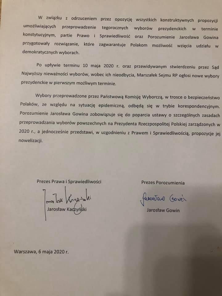 Wybory przeprowadzone przez Państwową Komisję Wyborczą, w trosce o bezpieczeństwo Polaków, ze względu na sytuację epidemiczną, odbędą się w trybie korespondencyjnym. Porozumienie Jarosława Gowina zobowiązuje się do poparcia ustawy o szczególnych zasadach przeprowadzania wyborów powszechnych na Prezydenta Rzeczpospolitej Polskiej zarządzonych w 2020 r., a jednocześnie przedstawi, w uzgodnieniu z Prawem i Sprawiedliwością, propozycje jej nowelizacji - głosi treść wspólnego oświadczenia.