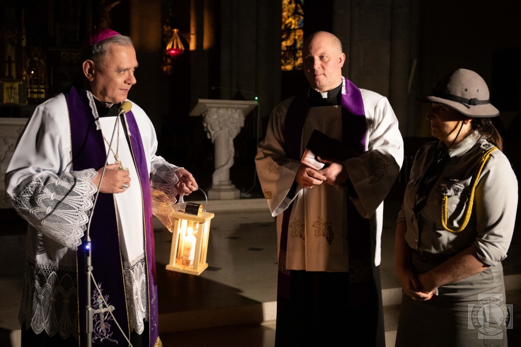 Betlejemskie Światło Pokoju przekazała na ręce bp. Ireneusza Pękalskiego hm. Natalia Patorska-Grzelewska, komendantka łódzkiej chorągwi Związku Harcerstwa Polskiego.