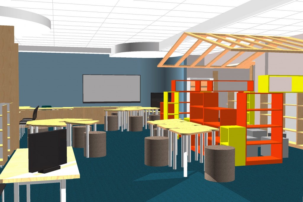 Jako element stały wprowadzony zostanie wydzielenie w postaci domku, który tworzą ustawione regały na książki w wyróżniającej się kolorystyce. Wyposażenie w sprzęt typu tablica interaktywna oraz nagłośnienie pozwoli na korzystanie z sali do organizacji spotkań z czytelnikami, prowadzenia lekcji, projekcji filmów itp.