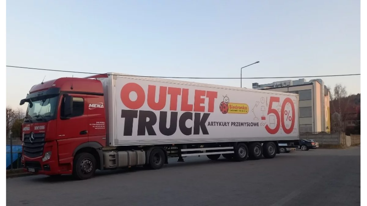 Mobilny outlet to specjalna naczepa–sklep, ustawiana zwykle na parkingu przy wybranym dyskoncie Biedronka. W środku znajdują się przecenione produkty przemysłowe, które pochodzą m.in. z nadwyżek magazynowych, końcówek serii i wcześniejszych promocji.
