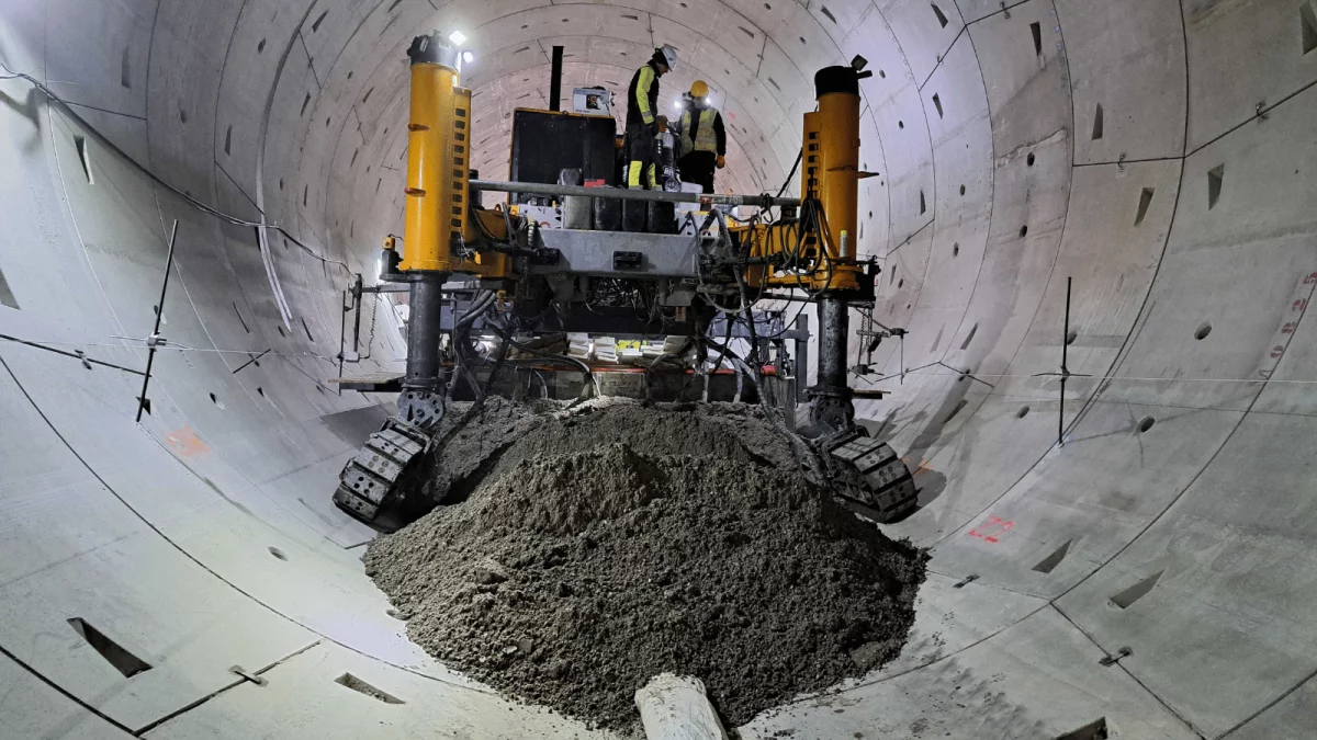 Specjalistyczna maszyna porusza się tunelami z prędkością kilku minut na metr. Najpierw konieczne jest dostarczenie gęstej masy, następnie jej ułożenie i dalej ubicie oraz poziomowanie.