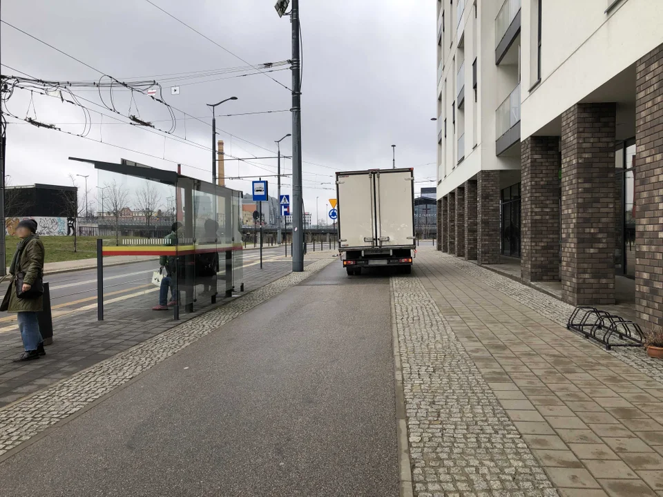 Choć dla pieszych jest dostępny chodnik, a dla rowerzystów droga dla rowerów, to często są to miejsca do zaparkowania na czas dostawy. Jeden z dostawców spotkanych na miejscu uważa, że ma prawo tak parkować, bo nie ma innego wyjścia.