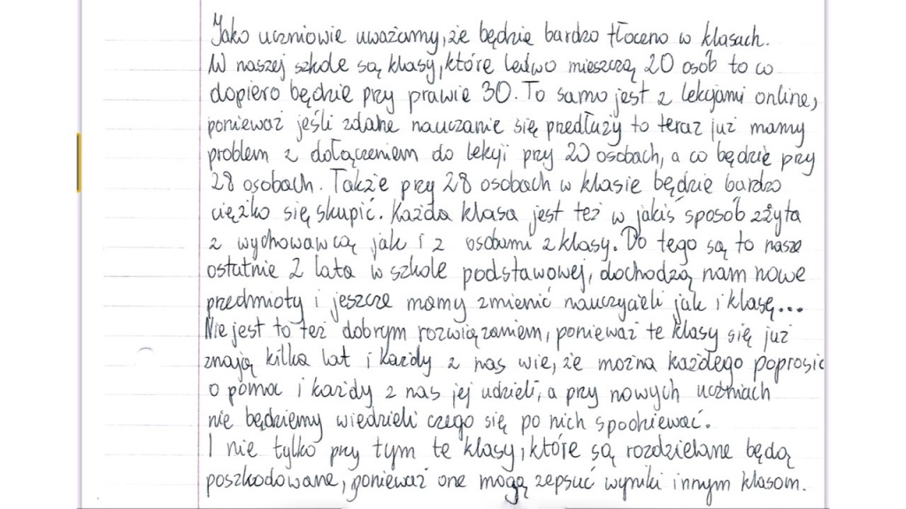 Jako uczniowie uważamy, że będzie bardzo tłoczno w klasach. W naszej szkole są klasy, które ledwo mieszczą 20 osób to co dopiero będzie przy prawie 30. To samo jest z lekcjami online, ponieważ jeśli zdalne nauczanie się przedłuży to teraz już mamy problem z dołączeniem do lekcji przy 20 osobach, a co będzie przy 28 osobach. Także przy 28 osobach w klasie będzie bardzo ciężko się skupić. Każda klasa jest też w jakiś sposób zżyta z wychowawcą jak i z osobami z klasy. Do tego są to nasze ostatnie 2 lata w szkole podstawowej, dochodzą nam nowe przedmioty i jeszcze mamy zmienić nauczycieli jak i klasę... Nie jest to też dobrym rozwiązaniem, ponieważ te klasy się już znają kilka lat i każdy z nas wie, że można każdego poprosić o pomoc i każdy z nas jej udzieli, a przy nowych uczniach nie będziemy wiedzieli czego się po nich spodziewać. I nie tylko przy tym te klasy, które są rozdzielane będą poszkodowane, ponieważ one mogą zepsuć wyniki innym klasom.