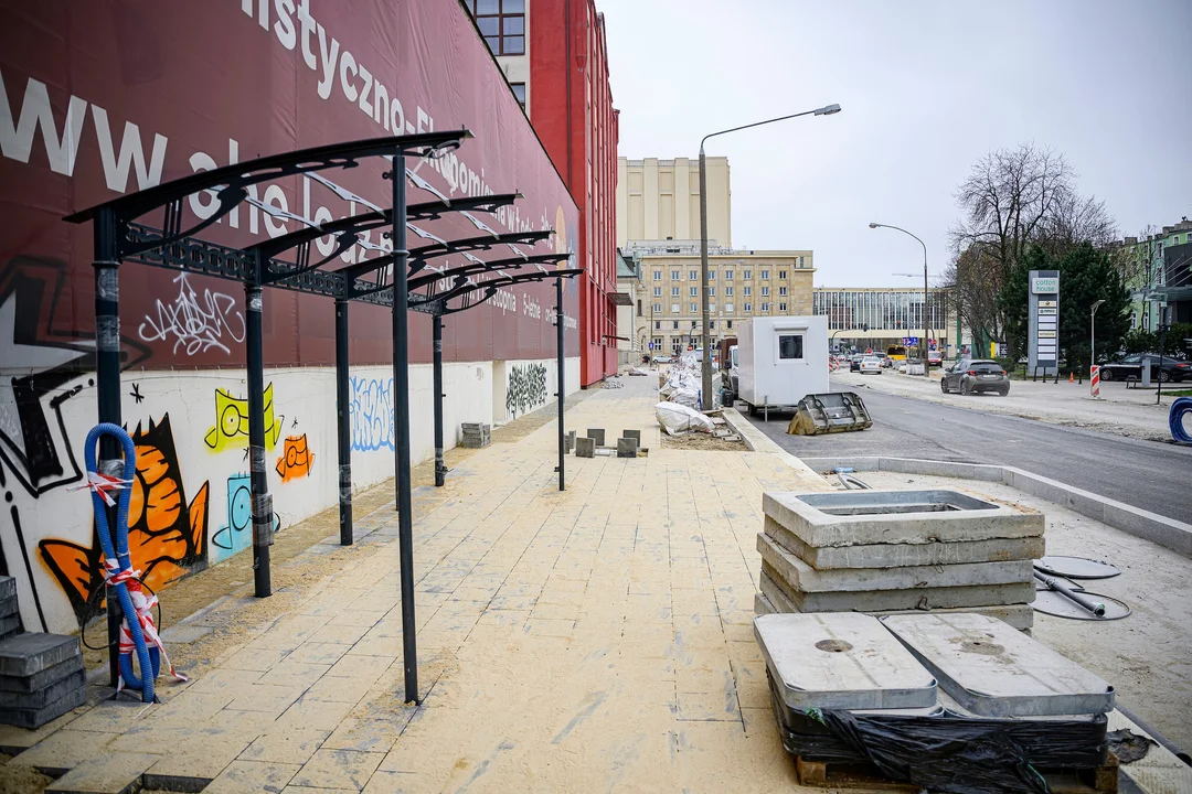Coraz lepiej widoczny jest także nowy przystanek autobusowy Sterlinga-Rewolucji 1905 r. w kierunku Pomorskiej. Stary i zniszczony chodnik został zamieniony na nowy peron przystankowy. Swoją lokalizację zmieni także wiata przystankowa - została przeniesiona bliżej budynku.