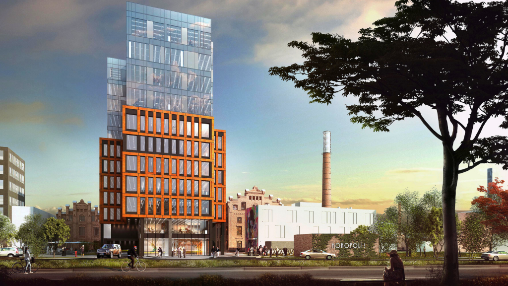 Elewacja siedmiu dolnych kondygnacji zostanie wykonana z kortenu, dzięki czemu fasada swoją naturalną patyną będzie nawiązywać do ponad stuletnich ceglanych budynków dawnego Monopolu Wódczanego. Górne kondygnacje to już przeszklona fasada, lekko cofnięta w stosunku do obrysu podstawy budynku. Obiekt zostanie wkomponowany w przestrzeń, łącząc nowoczesność z zabytkowym duchem miejsca.