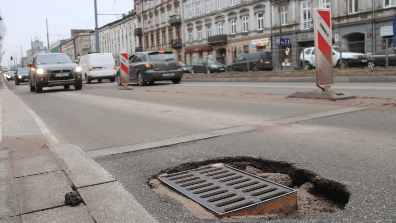 Utrudnienia dla kierowców w Łodzi - dziura przy studzience kanalizacyjnej w centrum miasta