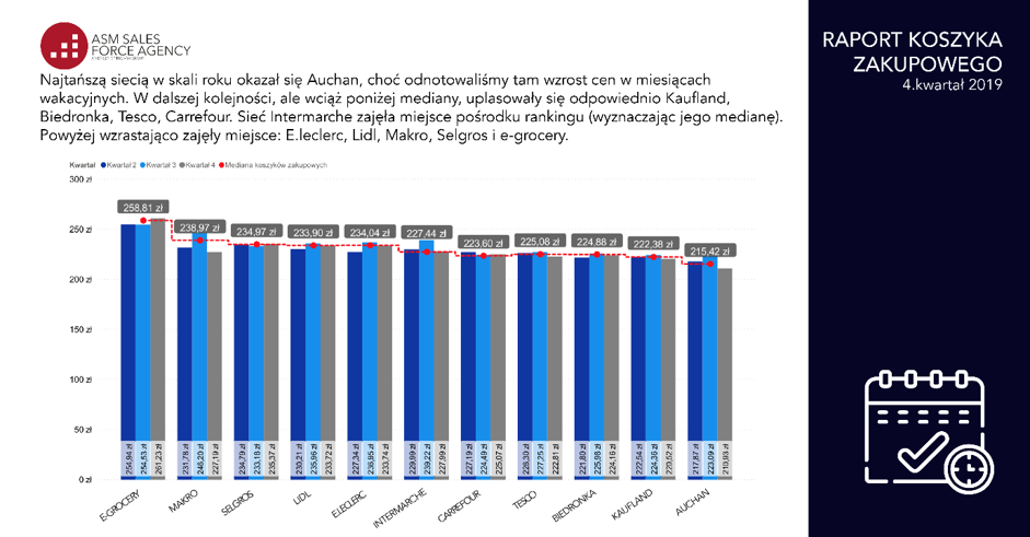 W grudniu 2019 r. odnotowano w Polsce nieznaczny wzrost cen uśrednionych badanego koszyka względem listopada (o 0,39 zł). Rozbieżność między najdroższym a najtańszym koszykiem okazała się w przybliżeniu dwukrotna. Nieznacznie spadły ceny w kanale sprzedaży internetowej produktów spożywczych (e-grocery), który jednak wciąż pozostaje droższy w stosunku do koszyka zakupowego w sklepach stacjonarnych. Choć nadal najtańszy w kategorii sklepów stacjonarnych był Auchan, to koszyk zakupowy w tej sieci także podrożał.