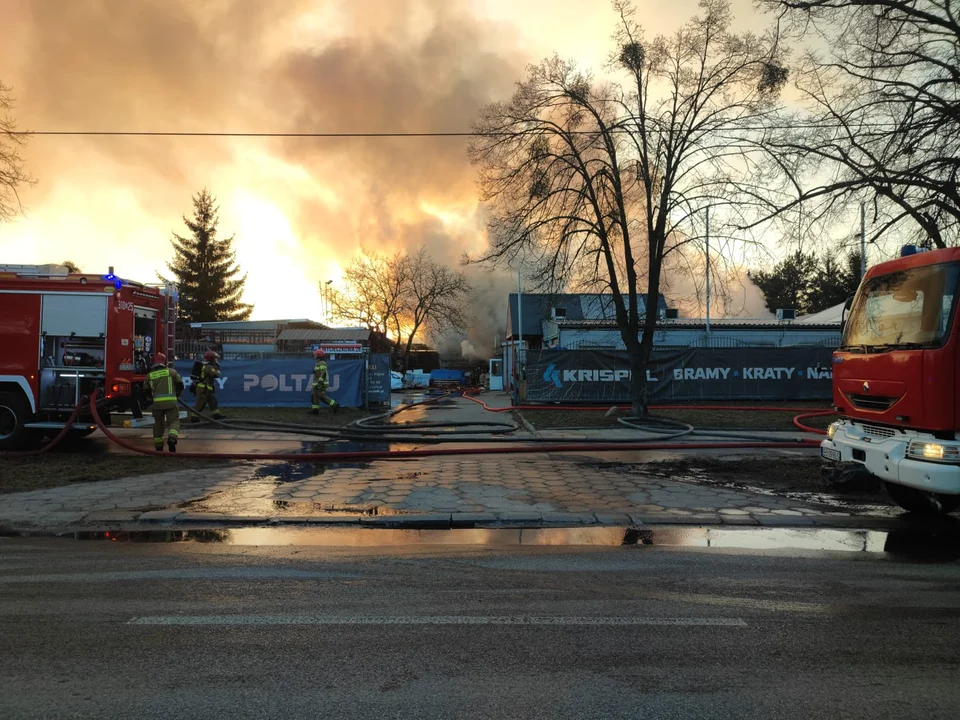 W jednej hali znajdowały się materiały do wypełniania drzwi oraz pianka poliuretanowa. Obiekt został całkowicie objęty pożarem. Cały czas przybywa zastępów, które walczą z żywiołem. Najpierw na miejsce zadysponowano ich jedenaście, na ten moment jest ich 19 - 15 PSP i 4 zastępy ochotniczej straży pożarnej.