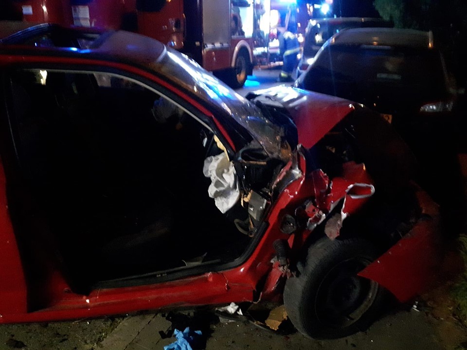Kierowca Volkswagenu Polo na prostym odcinku drogi z dużą prędkością uderzył w zaparkowane na poboczu auta. W wyniku zdarzenia poszkodowane zostały dwie osoby. Do rannych należało wykonać dostęp przy użyciu narzędzi hydraulicznych. Przewieziono ich do szpitala. Policja ustaliła, że kierowca był nietrzeźwy.