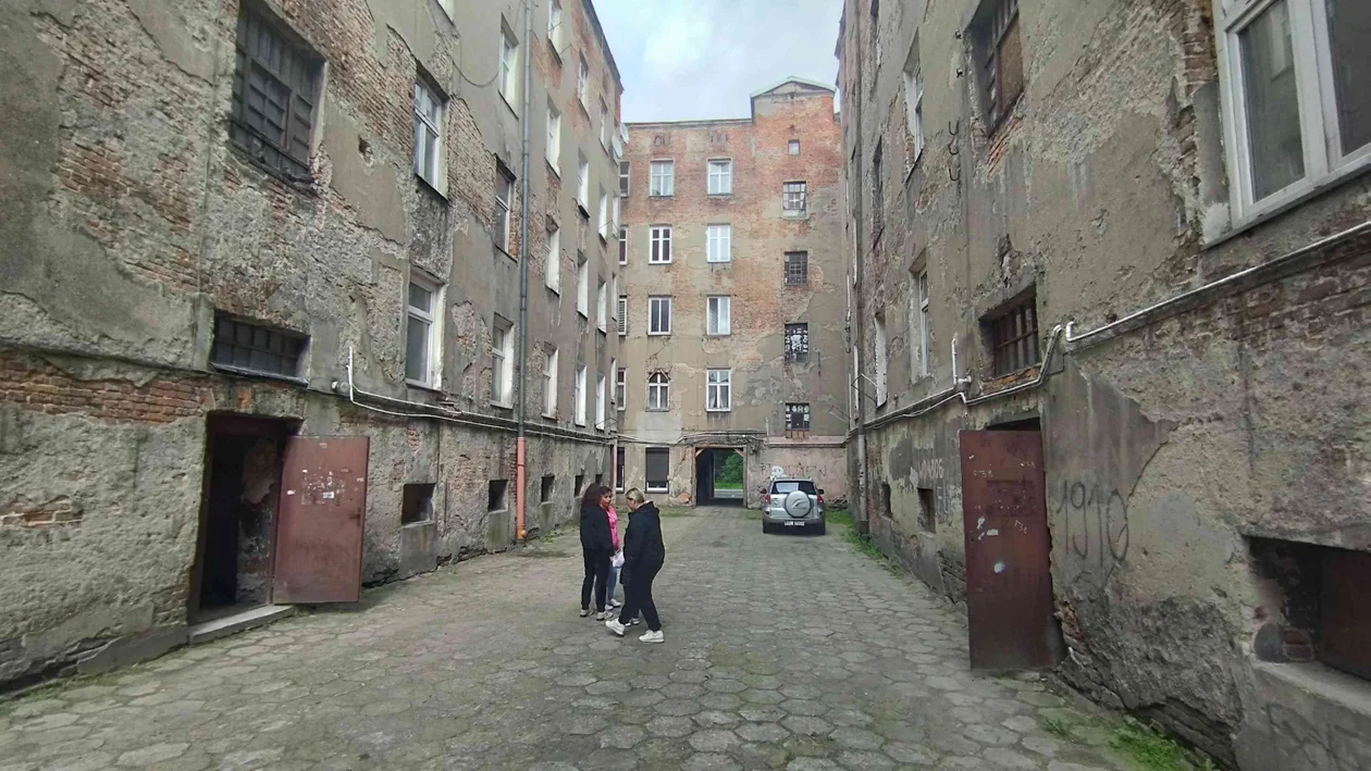 Pokryty zieloną siatką zabezpieczającą front kamienicy rzuca się w oczy z daleka. Gdy podchodzimy bliżej, widać drewniane wzmocnienia okien na parterze oraz dźwigary wspierające od wewnątrz bramę prowadzącą na podwórze. Na ścianach w wielu miejscach widać gołe cegły. Ze sklepienia bramy odpadł tak potężny kawał tynku, że widoczne są drewniane deski - to podłoga znajdującego się tuż nad bramą mieszkania. Nawet komuś nieznającemu się na budownictwie od razu przyjdzie do głowy, że nikt nie powinien w takim miejscu przebywać. Tymczasem spotykamy się z kilkoma osobami, które wciąż tu mieszkają.
