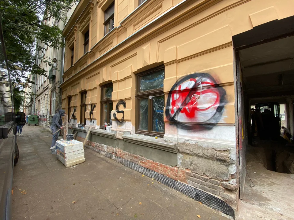 We wtorek 20 września okazało się, że na nowo odnowionej elewacji budynku, wandale pomazali graffiti. Ogromne kibicowskie napisy w niczym nie różnią się od tych, którymi usiane są ściany niemal wszystkich budynków okolicy.