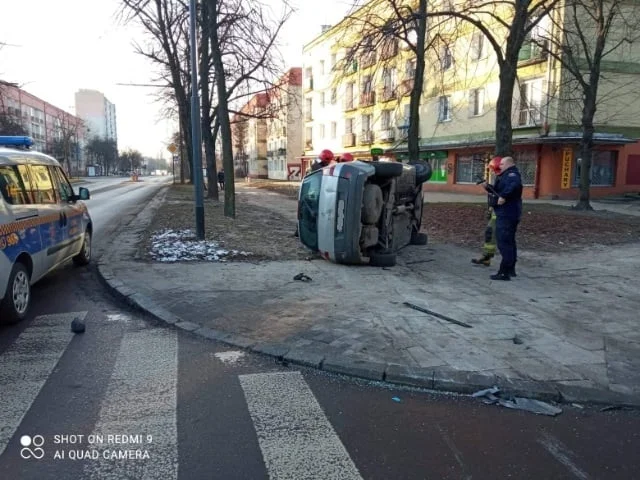 Przewrócony samochód na chodniku przy ul. Kasprzaka. Kierowca jechał na podwójnym gazie