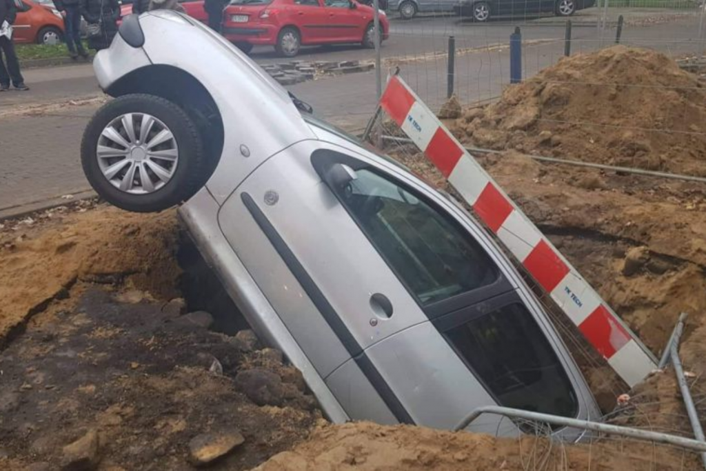 Kierowca próbował wydostać się z parkingu jednego z supermarketów przy ul. Zarzewskiej. W trakcie manewru cofania nie zauważył, że z tyłu znajduje się wykop i wjechał do niego tyłem samochodu.