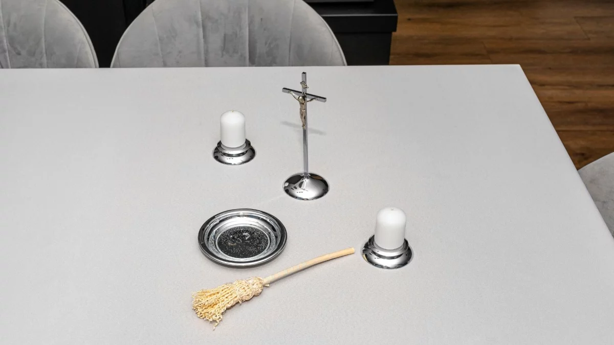 - ustawić krzyż, dwie świece, naczynie z wodą święconą i kropidło;