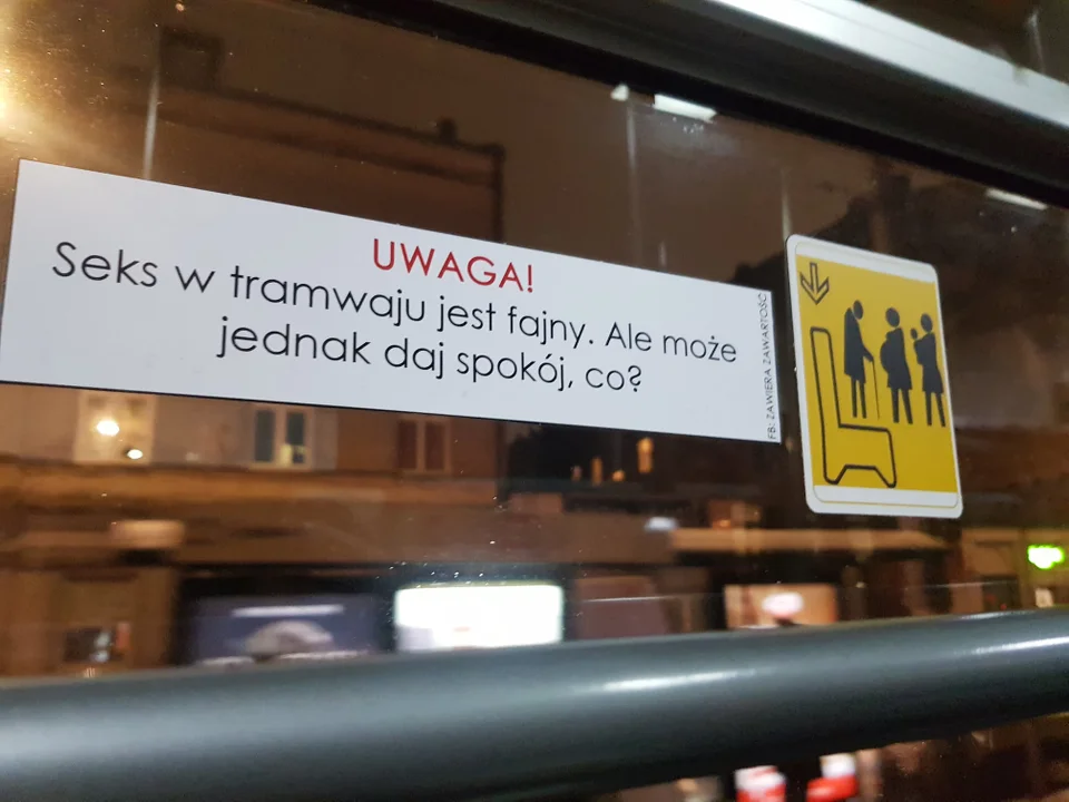 Łodzianie, którzy podróżują komunikacją miejską, mogą być zaskoczeni wlepkami łudząco przypominającymi naklejki informacyjne. Pojawiają się one od zeszłego miesiąca w różnych miejscach pojazdów, np. na szybach, biletomatach oraz nad drzwiami.
