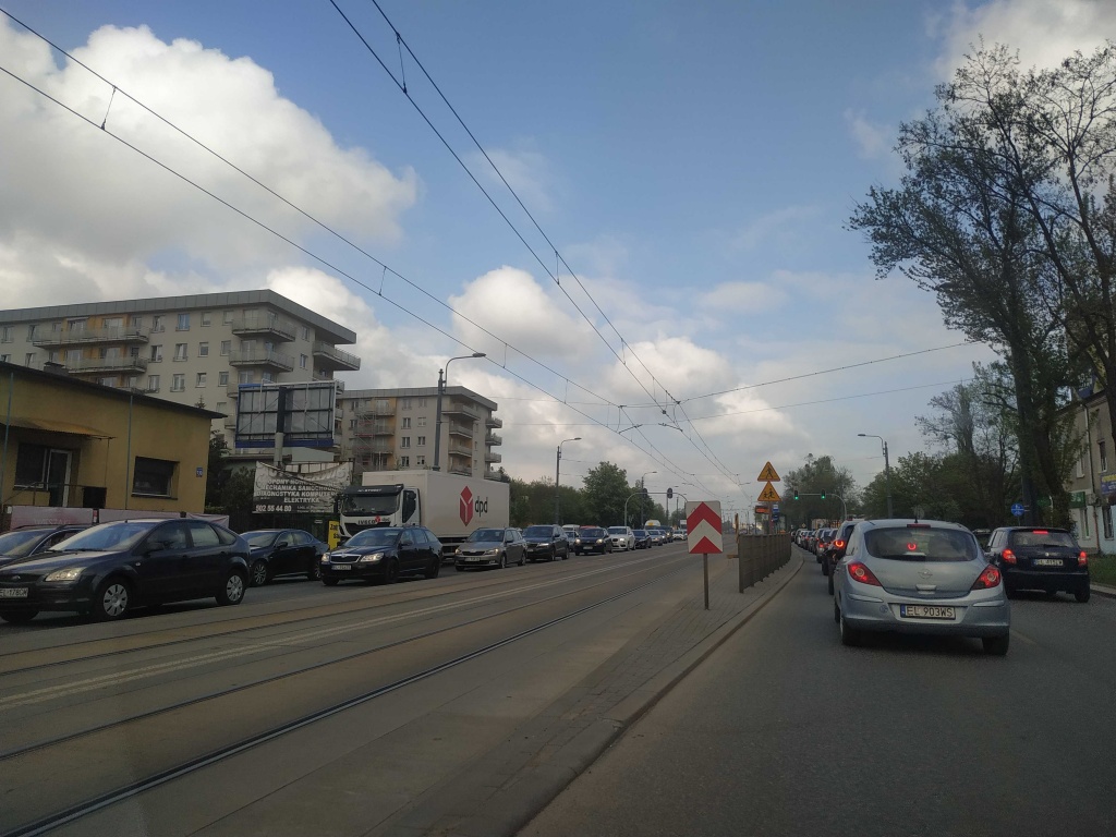 Korki Łódź. Przejazd kolumny pojazdów, potężne korki i opóźnienia komunikacji miejskiej