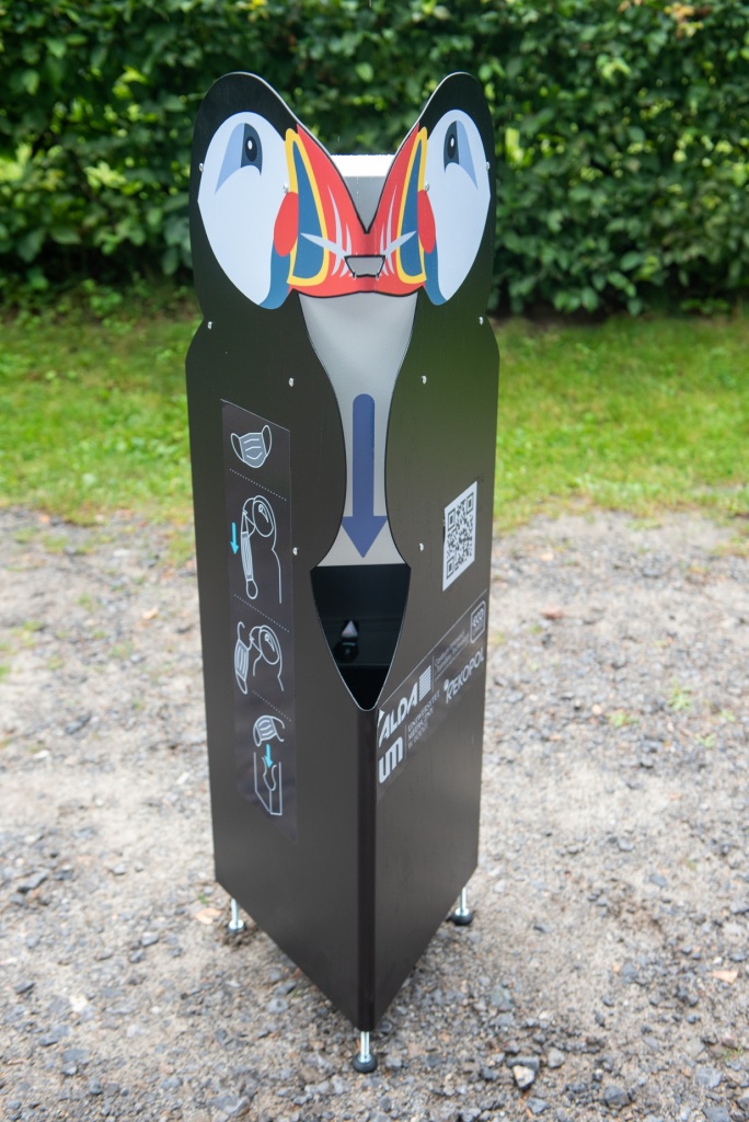 Maskonur to stalowy, dobrze wykonany, kolorowy kosz na odpady, kształtem i grafikami przypominający maskonura, którego dziób został skonstruowany tak, aby przed wyrzuceniem maseczki zerwać gumki. Maskonur jest tak charakterystyczny, że nie da się przejść obok niego obojętnie. Wychodząc np. z miejsca użyteczności publicznej – ściągasz maseczkę i co widzisz? Kolorowego maskonura z instrukcją – jak postąpić z maseczką.