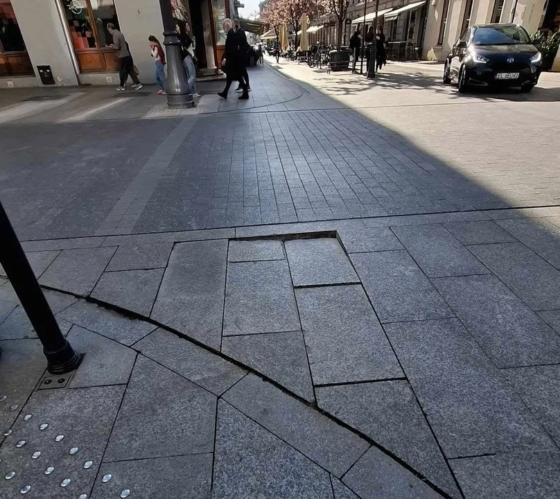 Chodzi o ulice Piotrkowską, 6 Sierpnia oraz Traugutta. Nawierzchnia tej pierwszej w wielu miejscach jest poważnie uszkodzona - brakuje fragmentów kostki brukowej. Na dwóch pozostałych ulicach doszło do zapadnięć granitowych płyt. Widoczne są też w nich wyraźne rysy, zaś kostka brukowa jest luźna i wypada z podłoża.