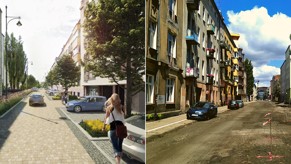 Po przebudowie jezdnia wykonana będzie z kostki betonowej w kolorze piaskowo-beżowym. Na brzegach i na wjazdach ułożona zostanie kostka granitowa łupana. Podobnie jak miejsca parkingowe, które zostaną utworzone prostopadle do jezdni dla 45 samochodów. To wszystko w otoczeniu zieleni, która daje cień mieszkańcom, wpływa na poprawę środowiska i obniża temperaturę w mieście.