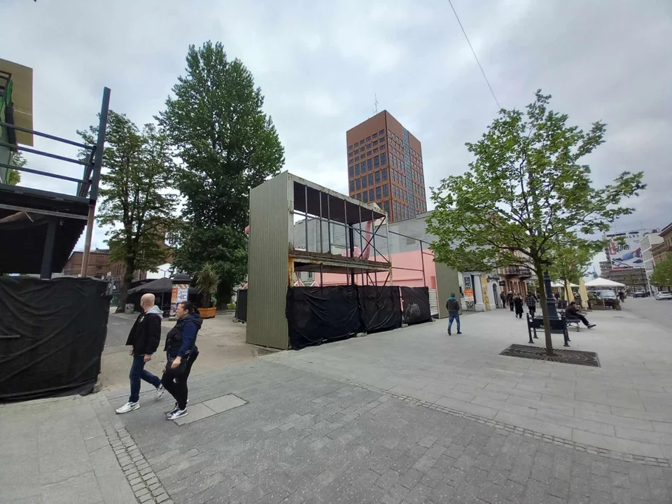 Zgodnie z umową najemca rozpoczął budowę lokalu na placu od strony ul. Piotrkowskiej. Musiał ją jednak przerwać, bo wysoka na 4,5 m ściana z blachy falistej wzbudziła protesty mieszkańców i WKZ. Obecnie konstrukcja jest przebudowywana.
